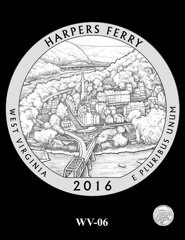 Design 6 (WV-06) features an overview of Harpers Ferry. The image includes the historic iron bridge crossing the Potomac River and the confluence of the Potomac with the Shenandoah rivers. The steep cliffs and canopy of trees surround the historic town center.