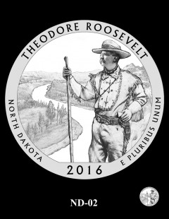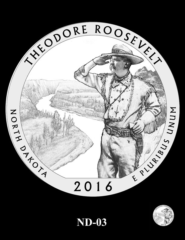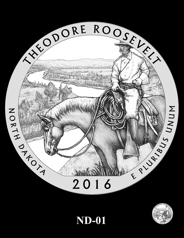 Design 1 (ND-01) features a young Theodore Roosevelt as he surveys the badlands terrain at an area near the Little Missouri River. Roosevelt is shown mounted on a horse.