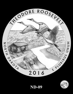 Design 9 (ND-09) shows three sandhill cranes as they fly over the North Unit of Theodore Roosevelt National Park.