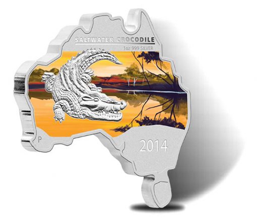 The largest living reptile is shown on the reverse of the 2014 Australian Map Shaped Saltwater Crocodile Silver Coin. Behind the crocodile, a colored background of wild wetlands at sunset appears.