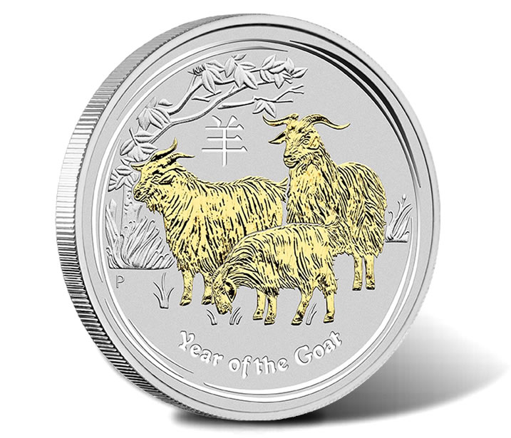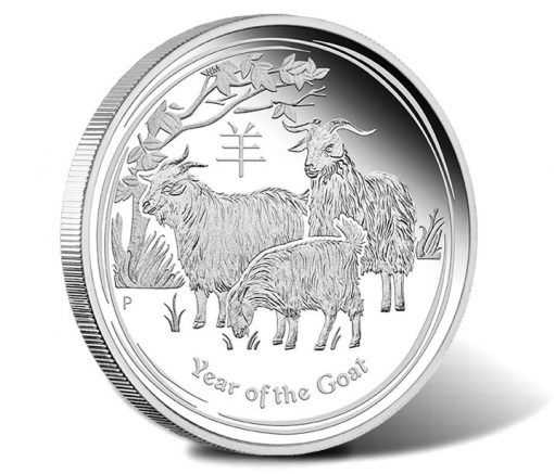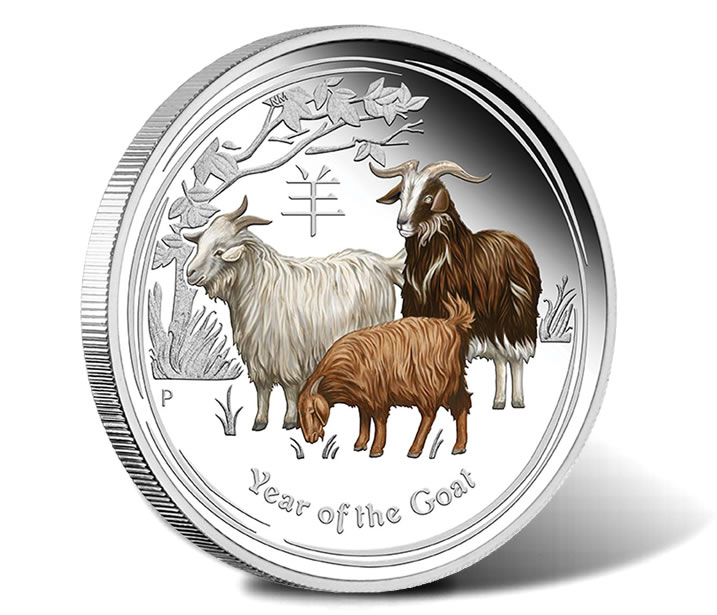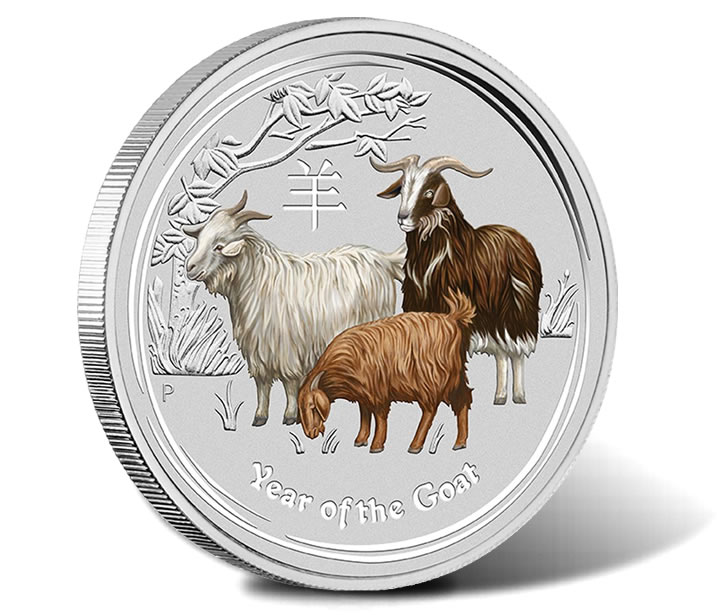 2015 Year of the Goat Silver Proof Colored Coins are found in 1 ounce and 1/2 ounce versions. Both bear a reverse image of three goats with the creatures in color to enhance their detail.