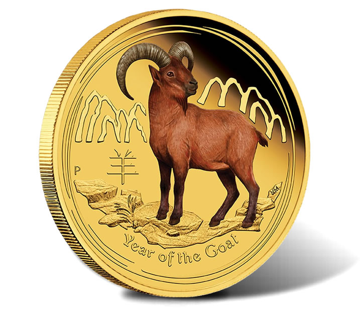 2015 Year of the Goat Gold Proof Colored Coins include three different sizes – 1 ounce, 1/4 ounce and 1/10 ounce. All three depict a single goat in color. Each proof quality coin is struck from 99.99% pure gold.
