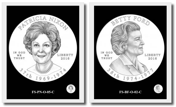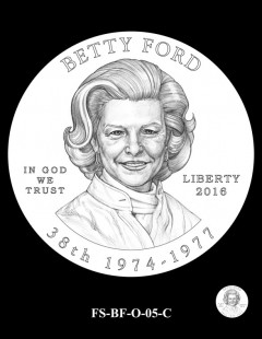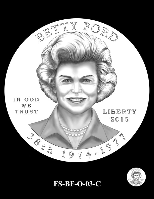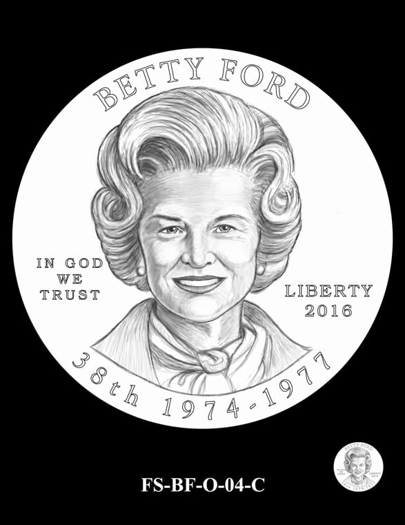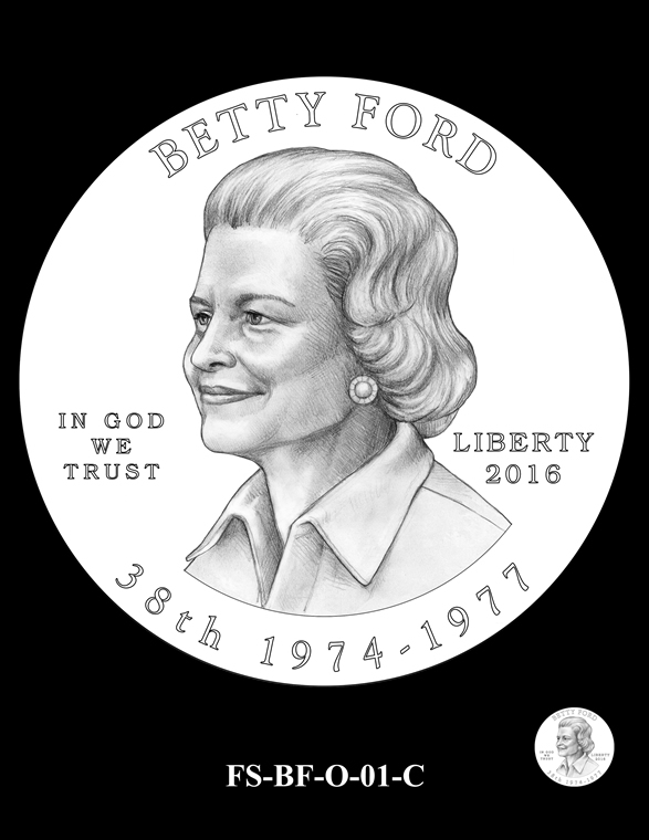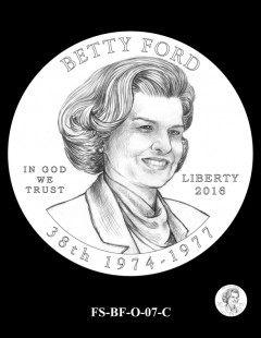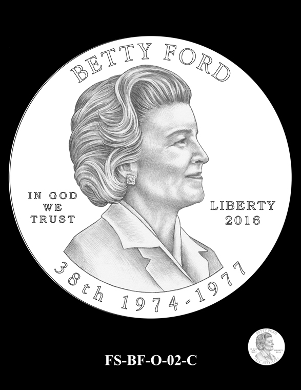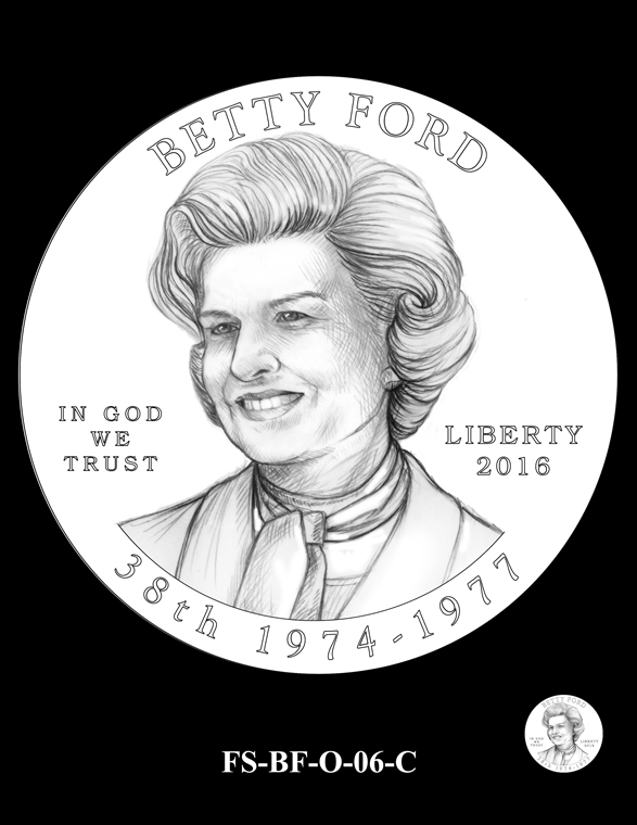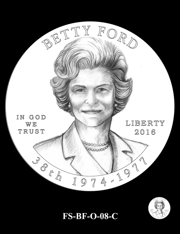 Eight obverse designs for Betty Ford coins were presented for review. Recommended Obverse: The CCAC liked design #1 and CFA selected design #2.