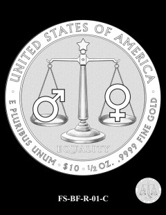 FS-BF-R-01 – This design shows the Scales of Justice holding the symbols of male and female as equal weights, representing equality between men and women. Mrs. Ford was a supporter of social and economic equality and an activist for the Equal Rights Amendment.