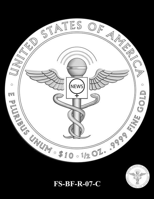 FS-BF-R-07 – This design features a stylized caduceus with a microphone in place of the rod. Mrs. Ford used her position as First Lady to engage in a public discussion of medical issues relevant to women.