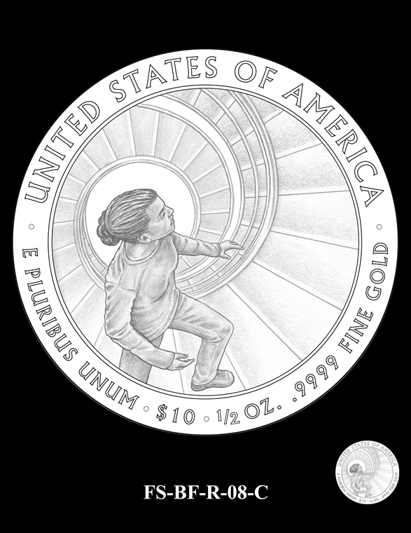 FS-BF-R-08 – A young woman ascends a spiral staircase. This design symbolizes Mrs. Ford’s legacy of inspiring others to achieve recovery from addiction through her example of openness and personal victory.