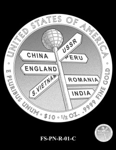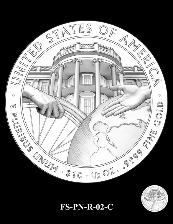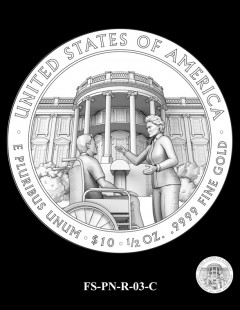 FS-PN-R-02 – This design commemorates Mrs. Nixon’s dedication to service. The wheel of the wheelchair represents her efforts to make the White House more accessible to everyone. The open hand represents her commitment to volunteerism, lending a helping hand to the world, and welcoming people to the White House. The globe represents her distinction as the most traveled First Lady at the time and highlights South America, representing her trip to Peru following a devastating earthquake.
