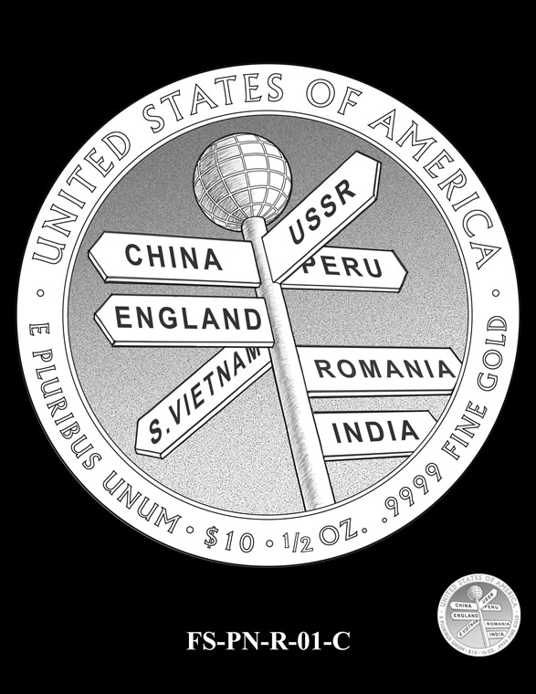 FS-PN-R-01 – This design features a directional sign indicating the names of many of the places Mrs. Nixon visited during her time as First Spouse. She was the most traveled First Lady until Hillary Clinton.