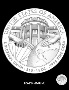 Five design candidates were presented for the reverse. Recommended Reverse: The CCAC liked design #5 and the CFA preferred design #3, if it was refined. They cited "the area across the mid-ground of the design as a confusing and poorly rendered combination of design elements, particularly the White House awning and the figure of Mrs. Nixon."