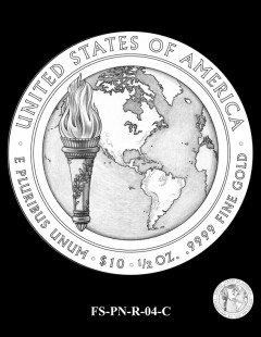 FS-PN-R-04 – This design depicts the earth with a torch featuring an olive branch, representing Mrs. Nixon’s international travel on behalf of the United States. While First Lady, Mrs. Nixon visited more than 75 countries.