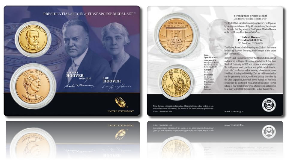 Listed at $9.95, this product has one uncirculated quality 2014-P Herbert Hoover Presidential $1 Coin and one Lou Hoover First Spouse Bronze Medal. The bronze medal and dollar coin, both struck at the Philadelphia Mint, are mounted on a decorative card with portraits of the two and their signatures.