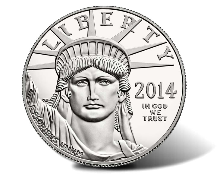 A modern interpretation of the Statue of Liberty is seen on the obverse. The image was designed and sculpted by former U.S. Mint Sculptor-Engraver John Mercanti and has appeared on proof Platinum Eagles since their 1997 debut. Obverse inscriptions include LIBERTY, IN GOD WE TRUST and 2014.