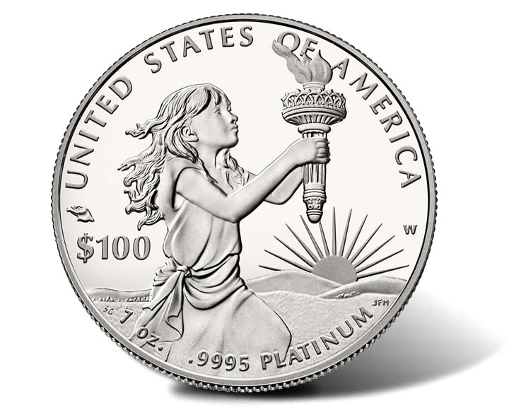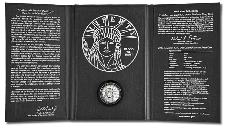 Struck at the West Point Mint after testing new finishes, the reverse or tails side of the 2014-W Proof American Platinum Eagle Coin is a design commemorating the concept "To Secure the Blessings of Liberty to Ourselves and our Posterity." The image offers a young Lady Liberty carrying her torch, symbolizing the hope and promise of America.
