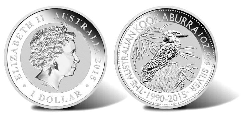 To celebrate 25 years of coins, the 2015 Australian Kookaburra silver bullion coin features the original design from 1990. It showcases an adult kookaburra sitting on a tree stump surrounded by eucalyptus leaves and a fern. A dual date of 1990-2015 is inscribed around the scene which differentiates it from its classic 1990 counterpart. Other inscriptions include THE AUSTRALIAN KOOKABURRA and 1 OZ. 999 SILVER.