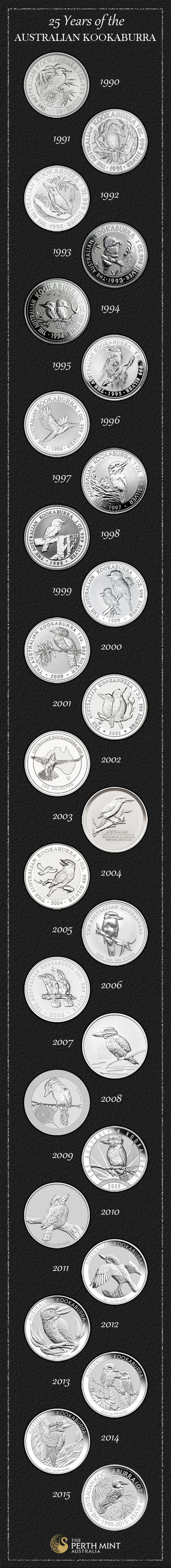 A graphic published by the Perth Mint, which is embedded directly below, shows designs on each of the 26 coins issued since 1990.