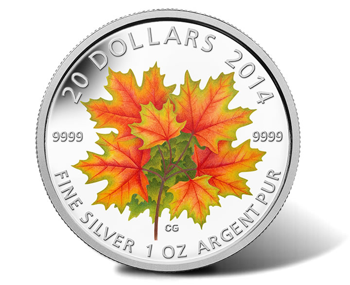 A new and unique collectible from the Royal Canadian Mint is its proof 2014 $20 Maple Leaves silver coin, featuring autumn coloring by day and a glow-in-the-dark appearance by night.