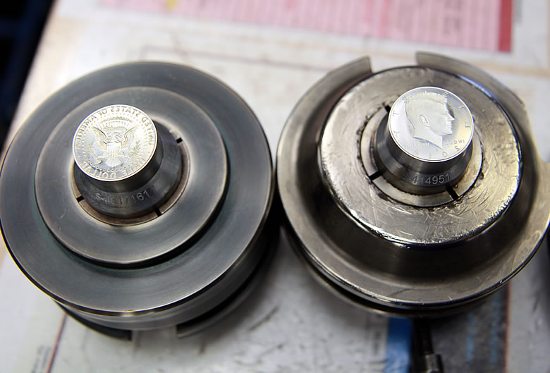 Below are two photos of obverse and reverse dies for 2014-S Enhanced Uncirculated Kennedy Half-Dollars. The first photo offers a close-up of a pair while the second photo shows two fitted within collars so they can be installed inside a coining press (more about that later).