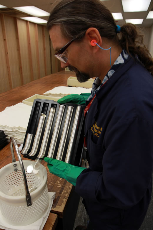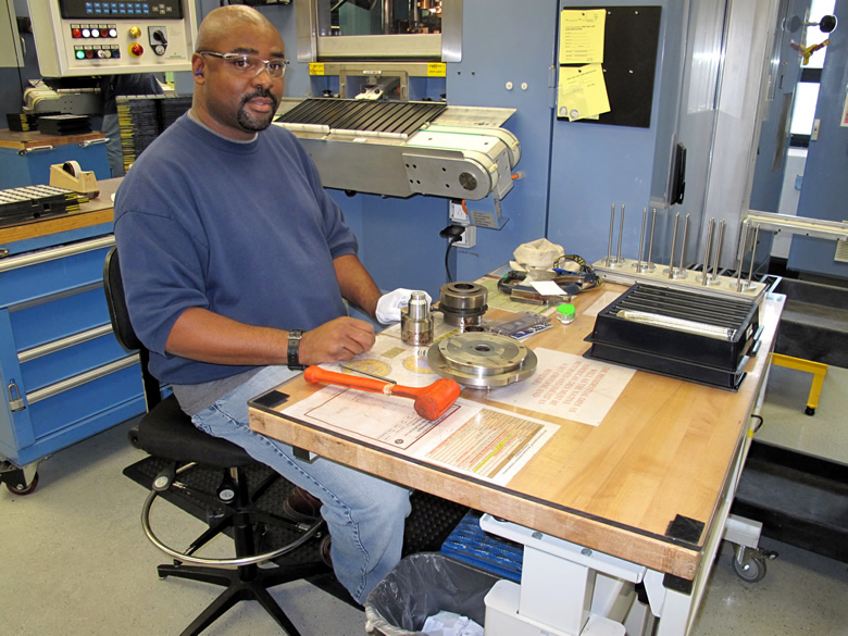 And in the next photo and video, we see Die Setter Stanley Mayfield. The video shows Mayfield assembling the die tooling for the reverse of the 2014-S Enhanced Uncirculated Kennedy Half-Dollar.