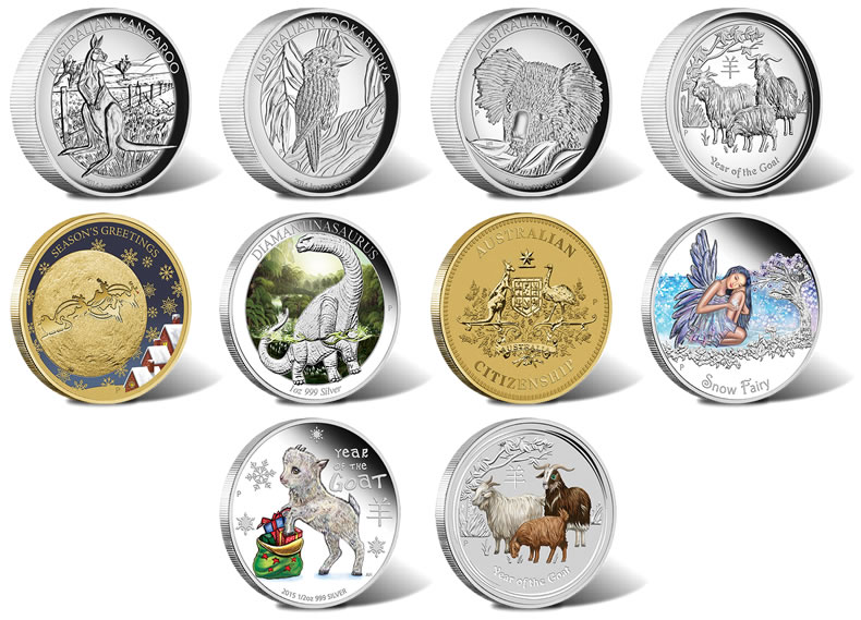 Among November products from the Perth Mint of Australia are Year of the Goat coins, a collection of high relief kookaburra, kangaroo and koala silver coins, and another dinosaur-themed coin. And, with a nod to the upcoming holiday season, the Perth Mint offers a 2014 Christmas Stamp & Coin Cover.