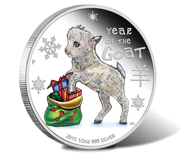 In keeping with the lunar theme of goats, the Perth Mint has created the 2015 Baby Goat 1/2 oz Silver Proof Coin. The reverse design of a baby goat is enhanced for the holidays with the inclusion of snowflakes and a colorful sack of gifts.