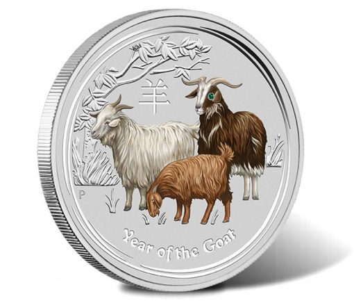 An emerald gemstone is set as part of the reverse design on the 2015 Year of the Goat 1 Kilo Silver Gemstone Coin. The emerald is used in place of one of the eyes of the three goats seen on the colored reverse image.