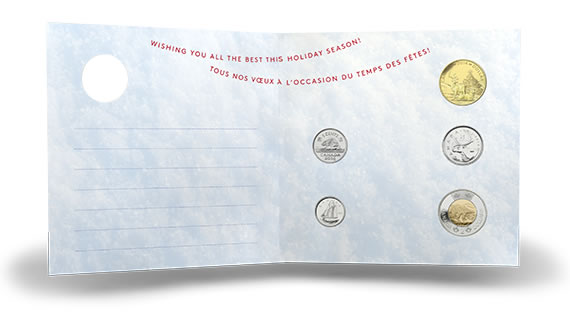 The five coins of the set are attached to a display folder which also includes room for a personalized message. Pricing of the set is CAD $19.95, or about US $17.62.