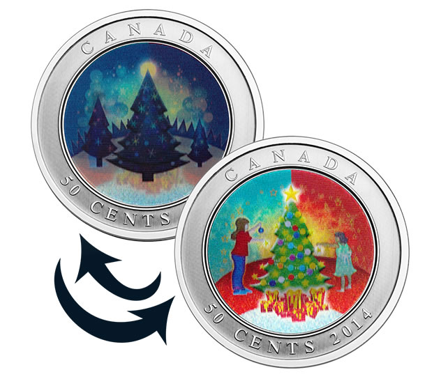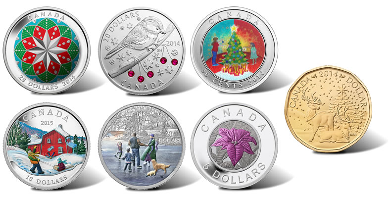 New coins from the Royal Canadian Mint celebrate the holiday season with festive designs to include Christmas trees, ornaments, poinsettias and joyful family activities.