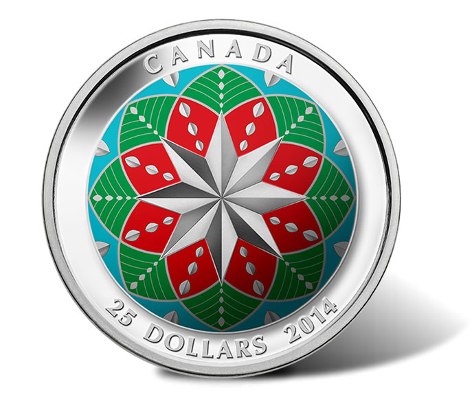 Issued as the Royal Canadian Mint’s first ultra-high relief coin with color, the 2014 Christmas Ornament coin depicts a stylized circular ornament centered around a deeply indented star.