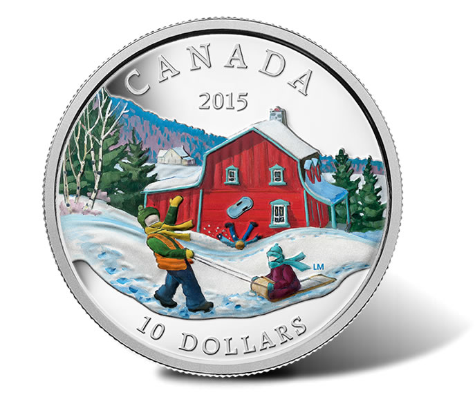 This year’s winter scene coin shows three children tobogganing behind their red snow-covered house. The colored scene also depicts a gently rolling countryside off in the distance.