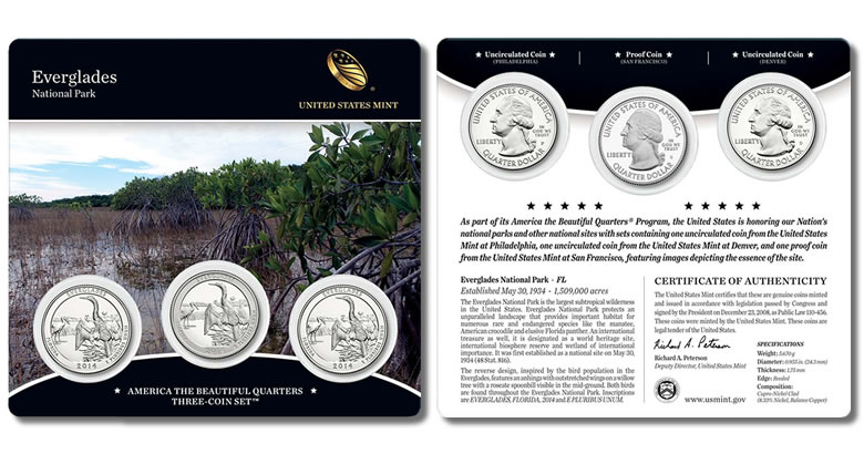 Today, Nov. 18, the United States Mint released the 2014 Everglades National Park Quarters Three-Coin Set for $9.95, the same price as 14 past sets which remain available.