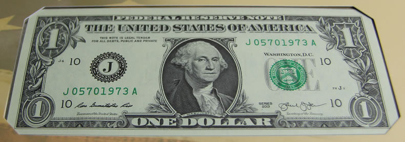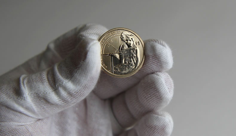 The 2014 American $1 Coin and Currency Set. The tri-fold folder that holds the $1 coin and $1 bill slides inside the envelope, which is shown to the left.This photo shows the obverse or heads side of a 2014-D Enhanced Uncirculated Native American $1 Coin. A standard uncirculated finish is used for Sacagawea, for part of her clothing, for her baby, and the inscriptions LIBERTY and GOD WE TRUST. The field of the coin has a standard frost finish.A closer view of the coin’s obverseThis photo shows the reverse or tails side of a 2014-D Enhanced Uncirculated Native American $1 Coin. The light laser frost treatment used in areas of the Native American man and his wife contrast nicely with the standard laser frosting featured on the coin design’s background. A standard uncirculated finish is used on the inscriptions of NW, UNITED STATES OF AMERICA and $1.A closer view of the coin’s reverseThe $1 coin is relatively easy to remove from the set. With the set open and as shown in the photo above, you can pop off the capsule’s top to remove the coin.An uncirculated 2013 $1 Federal Reserve Note printed for the Federal Reserve Bank of Kansas City is also held with the set’s tri-fold folder.The Kansas City Federal Reserve Bank designation appears right above the dollar bill’s serial numberThe back of the dollar