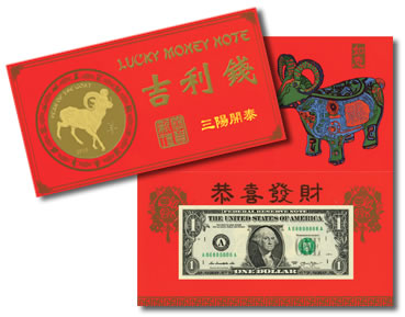 Year of the Goat Lucky Money $1 notes are priced at $5.95 each, like last year’s lucky money celebrating the Year of the Horse. Also like last year, discounts are available in larger quantities with prices cut to $4.50 each when ordering 50 to 999, and as low as $3.95 each when ordering 1,000 or more.