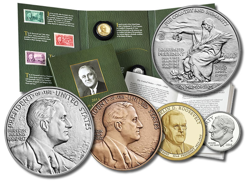 A limited-edition set is available today featuring collectible coins, medals and stamps with portraits of Franklin D. Roosevelt and a booklet chronicling his life.