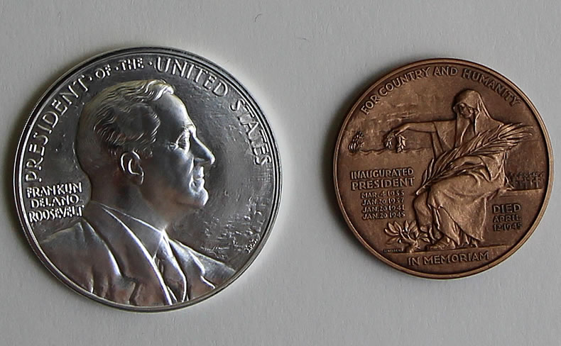 Both medals share the same designs, which were created by John R. Sinnock for the 1945 Franklin D. Roosevelt Presidential Medal. Having seen FDR’s portrait on dimes all my life, it’s not the front of the medals that invoke their greatest appeal — although their larger portraits and contoured backgrounds are definitely more unique.