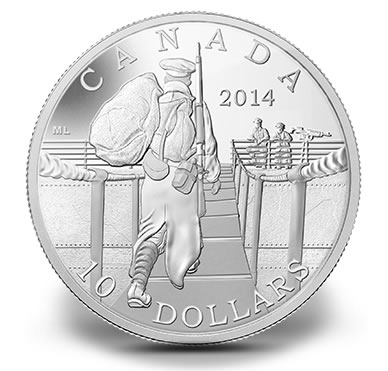 This one-half ounce silver coin features a reverse design depicting a rear view of a Canadian soldier as he embarks on a ship bound for England. The scene is inspired by the largest single movement of Canadians during the First World War and the largest convoy up to that point which left the shores of Canada for England on October 3, 1914.