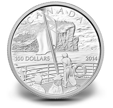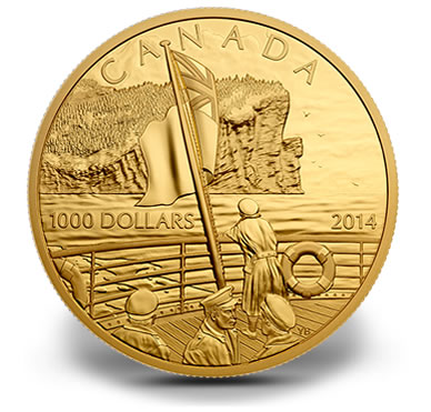 Rare in size at 10 ounces, this proof silver coin shows a departing soldier aboard a ship leaning against its rail and taking on last look at the Canadian coast — the soaring cliffs of the Gaspe Peninsula. The Canadian Red Ensign is seen flying overhead.
