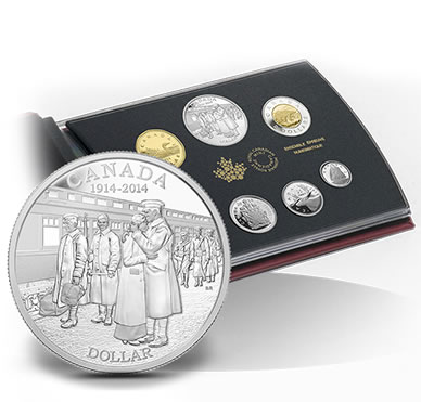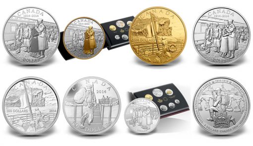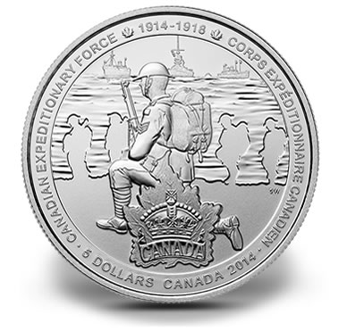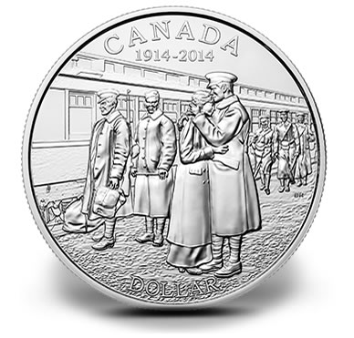 2014 coins depict imagery related to the 100th anniversary of the declaration of the First World War. Subsequent program issues will include designs emblematic of themes such as the Canadian Home Front, Canada on the Battlefront, a Building of the Nation, War Stories, and Peace and Legacy.