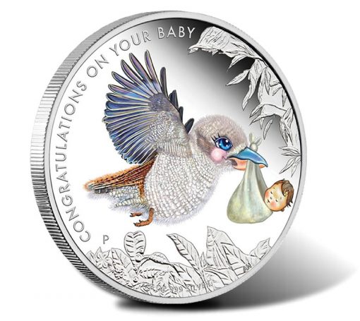 A perfect gift for the newborn or the excited parents is the 2015 Newborn Baby 1/2 oz Silver Proof Coin. It offers a colorful image of a kookaburra carrying a sleeping newborn baby.