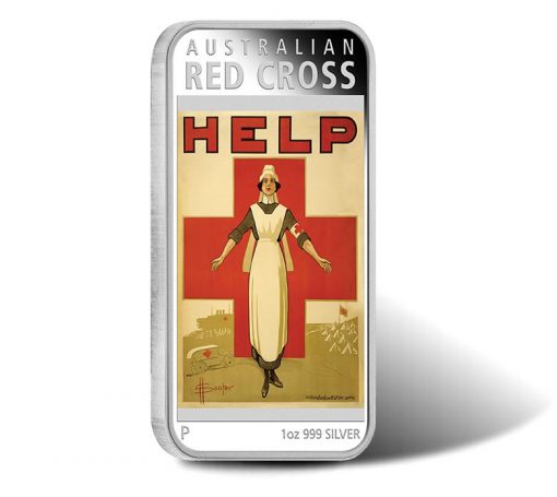 The 2015 Red Cross Silver Proof Rectangle Coin, the second in a series of colored reverses depicting classic World War I posters, features an Australian Red Cross woman with her arms outstretched.