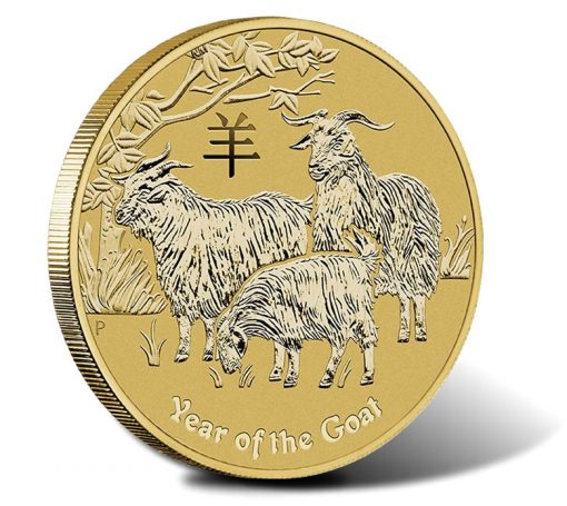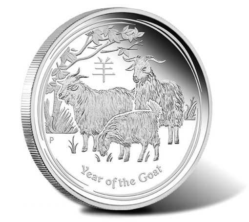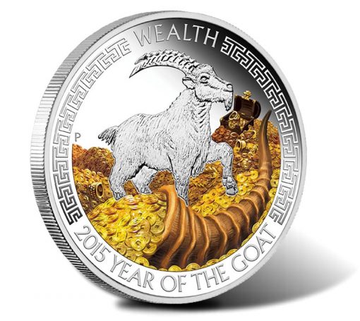 The 2015 Year of the Goat Wealth 1 oz Silver Proof Coin has a colored reverse design of a single goat standing on a pile of gold coins and other riches. Mintage of this Tuvalu legal tender coin is capped at 5,000. It is priced at AUS $90, or about US $73.