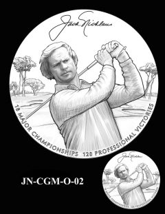 In total, there are 9 design candidates. They include 5 for the obverse or heads side that feature a portrait of Nicklaus and 4 for the reverse or tails side that include stylized designs and inscriptions recognizing his integrity and dedication to charitable causes.