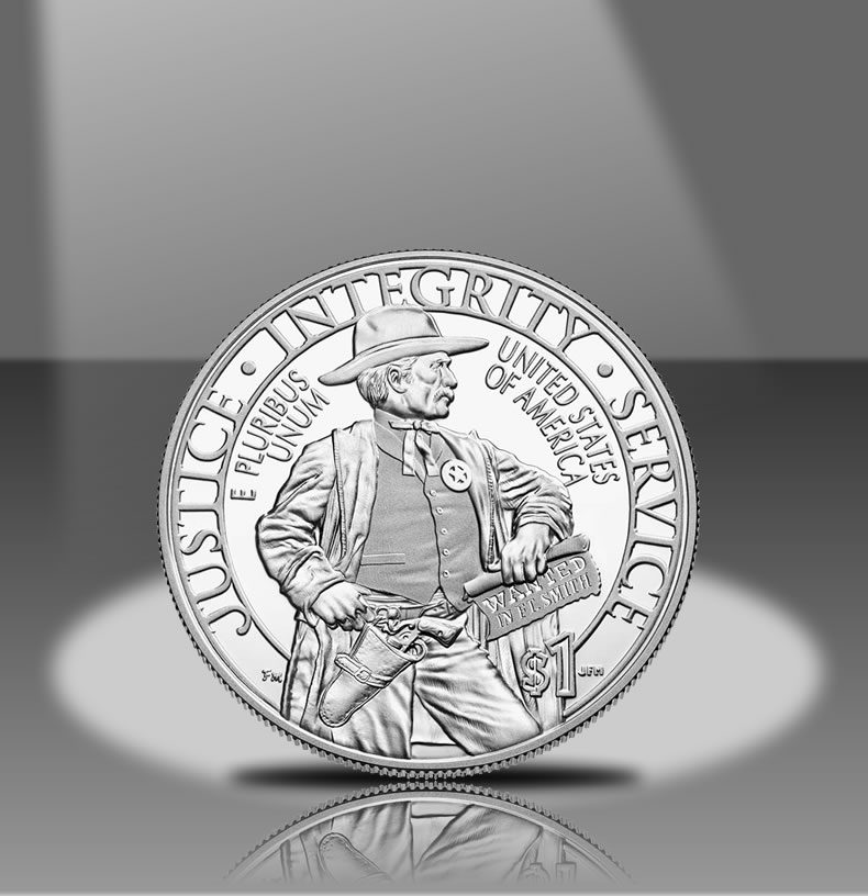 Reverses honor the agency’s legendary status in history. Designed by Frank Morris and sculpted by Joseph Menna, they depict a frontier U.S. Marshal leaning against a post and holding a wanted poster. Inscription include WANTED IN FT. SMITH, JUSTICE, INTEGRITY, SERVICE, E PLURIBUS UNUM, UNITED STATES OF AMERICA and $1.