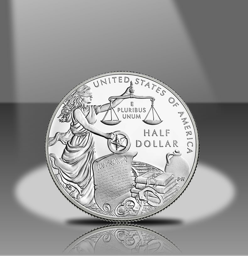 Reverses have elements representing pivotal issues in American history, and tie the Marshals to the United States Constitution. Designed by the late Susan Gamble and sculpted by Phebe Hemphill, they depict Lady Justice holding the scale of justice in her left hand and the U.S. Marshals Service star in her right. Next to Lady Justice is a copy of the United States Constitution, a stack of school books, handcuffs and a whiskey jug, objects symbolizing well-known areas of responsibility in the history of the U.S. Marshals Service. Inscriptions include UNITED STATES OF AMERICA, E PLURIBUS UNUM and HALF DOLLAR.