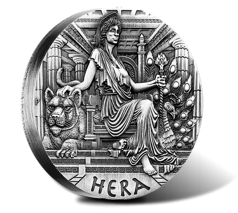 Coins of the Goddess series feature antique finishes with rimless designs. Each is composed of two ounces of 99.9% pure silver. Shown on the reverse of the first program issue is a depiction of the mythical goddess Hera.