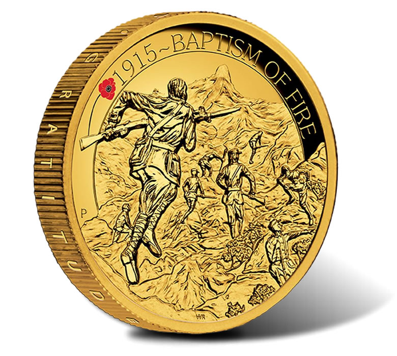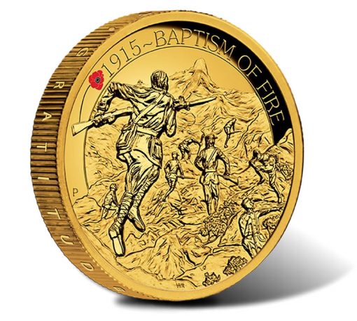 The Perth Mint’s ANZAC Spirit 100th Anniversary Coin Series features a new release in two ounces of 99.99% pure gold with the 2015 $200 Baptism of Fire Gold Proof High Relief Coin.