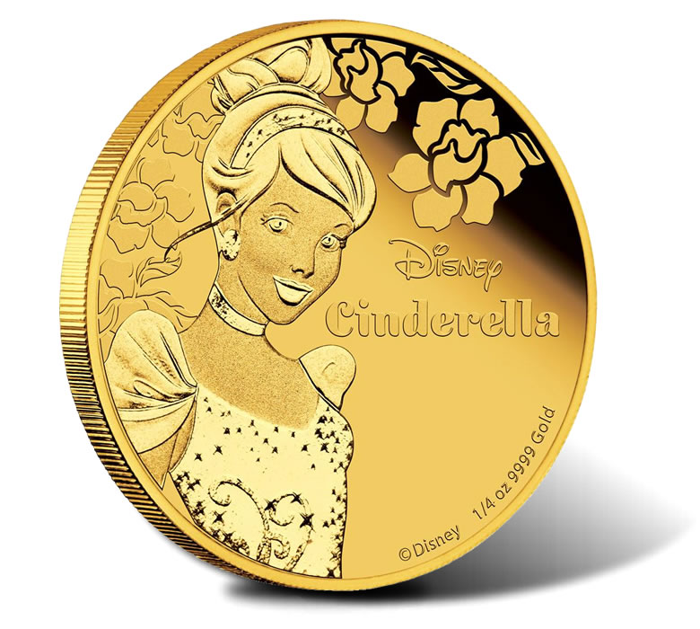 Limited to 1,000 and priced at AUS $754.55 or US $589.58, Disney Princess Cinderella gold coins are struck in one-quarter ounce of 99.99% fine gold to a diameter of 20.60 millimeters.