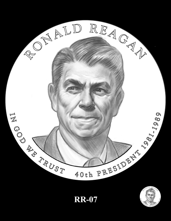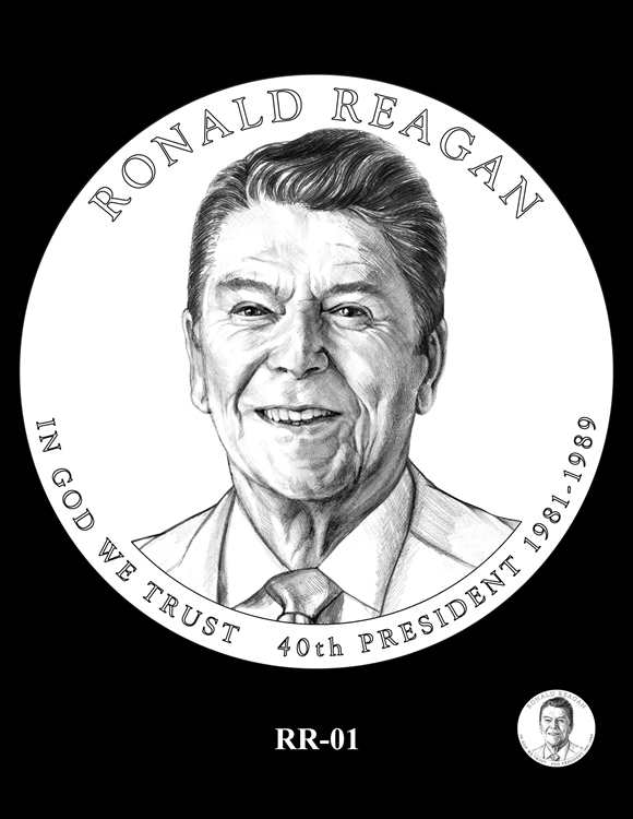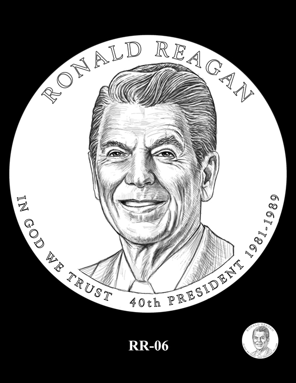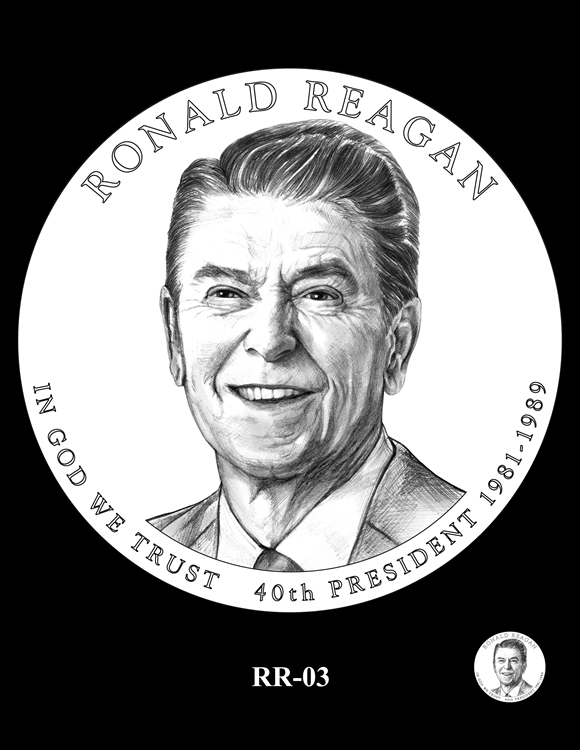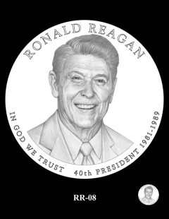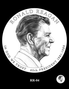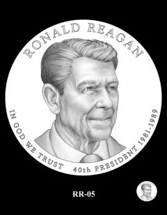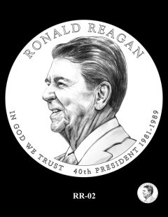 Inscriptions are the same around each portrait, reading: RONALD REAGAN, IN GOD WE TRUST, 40TH PRESIDENT and 1981-1989 for his years as commander-in-chief.