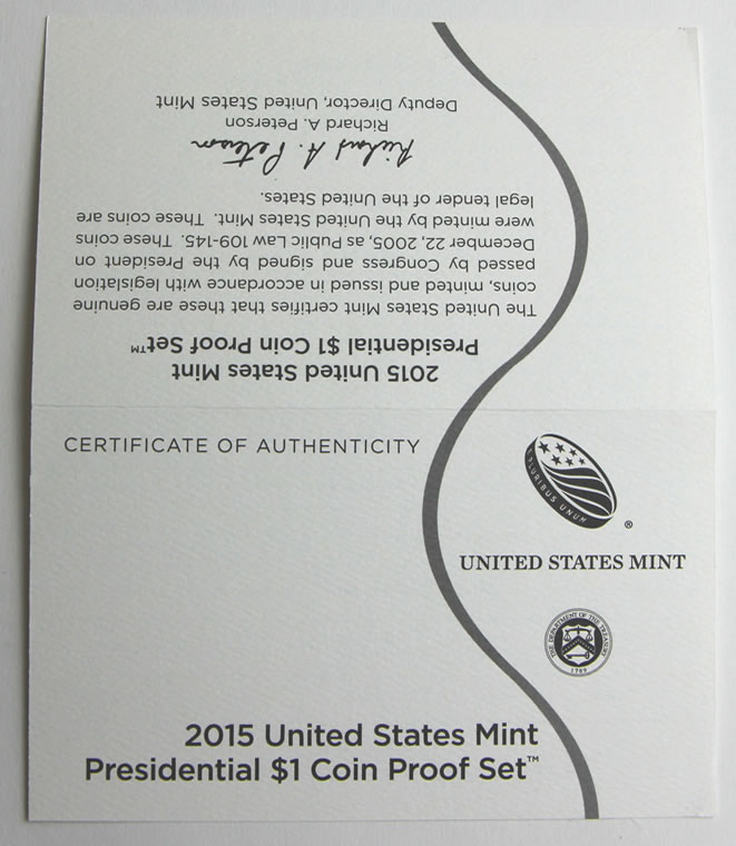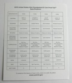 All proof sets ship with a certificate of authenticity. The back of certificate also displays specifications of the four clad Presidential $1 Coins to include names of the designers and sculptors.