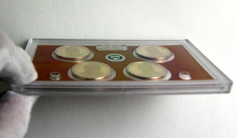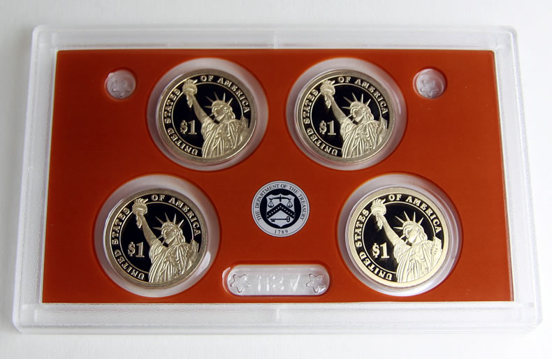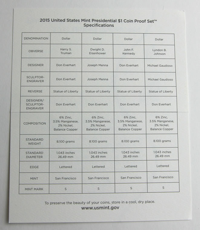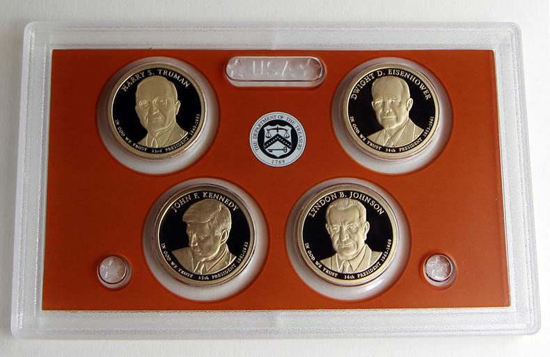 Inside the set are collector proof versions of the $1 coins commemorating Harry S. Truman, Dwight D. Eisenhower, John F. Kennedy, and Lyndon B. Johnson. Proof coins feature frosted designs that contrast against mirror-like backgrounds, making them very popular with collectors.