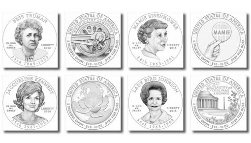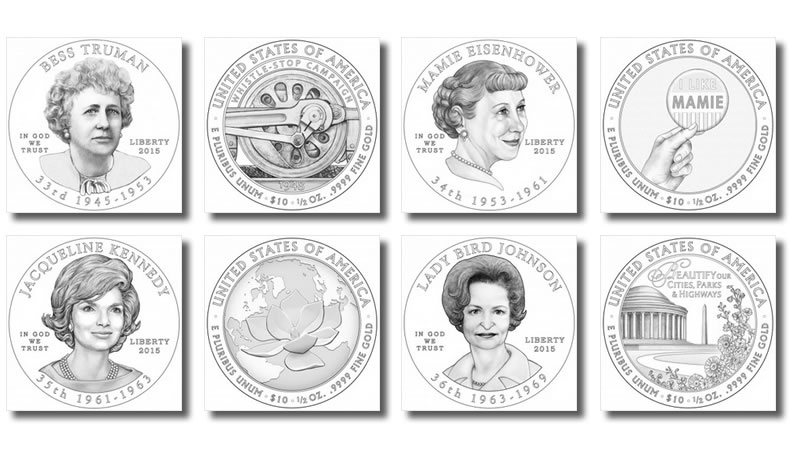 The U.S. Mint unveiled designs for the one-half ounce 24-karat 2015 First Spouse Gold Coins commemorating Bess Truman, Mamie Eisenhower, Jacqueline Kennedy and Lady Bird Johnson.